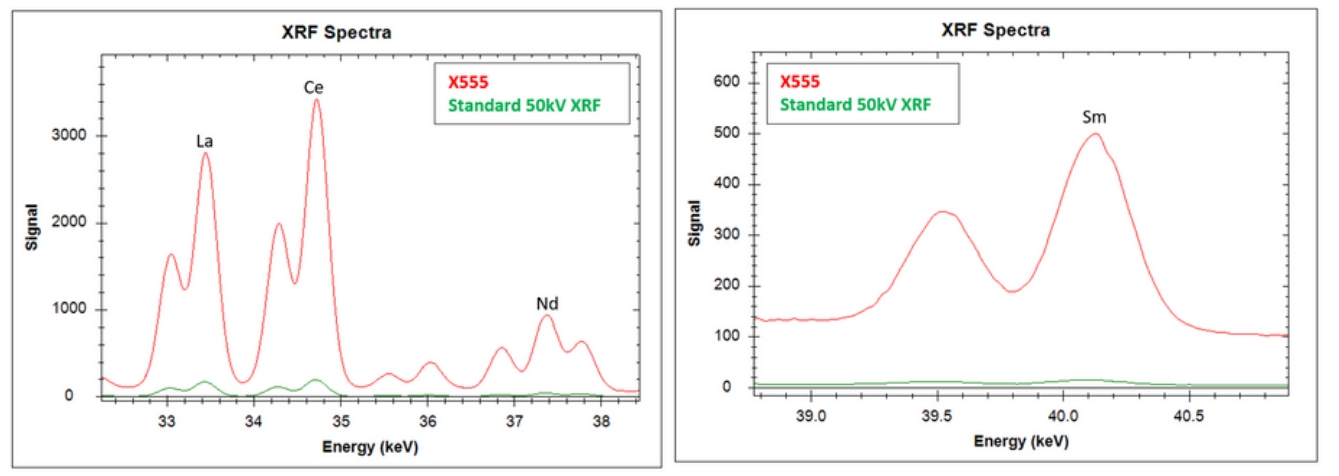 X-555利用55kV X射線管能更好地激發(fā)稀土元素能量。超大的70mm2 SDD硅源移探測器,更有效地檢測到更高的能量釋放,這實現(xiàn)了10倍更高的計數(shù)率(如:鑭)和30倍更高的計數(shù)率(如:釤Sm)。