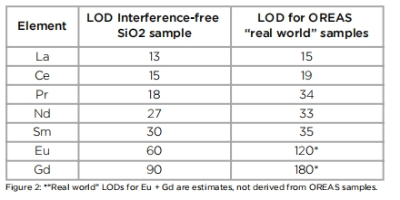 手持設備中的典型的X射線管只能工作到50 kV,稀土元素的有效激發(fā)能量差。而SciAps X-555采用55 kV的X射線管,大約能產(chǎn)生10倍以上的X射線有效激發(fā)能量。無干擾(二氧化硅)和高度具有挑戰(zhàn)性的OREAS REE礦石的值(這可以在圖2中找到)。LOD用于背景以上的3西格瑪檢測,120秒的測試時間。Sciaps光譜儀可作為化探手段。有規(guī)劃的進行土壤、巖石露頭測試,剖面測試,光譜數(shù)據(jù)可作為地質(zhì)資料。常用礦石模式和土壤模式。無需進行樣品制備或簡單樣品制備。