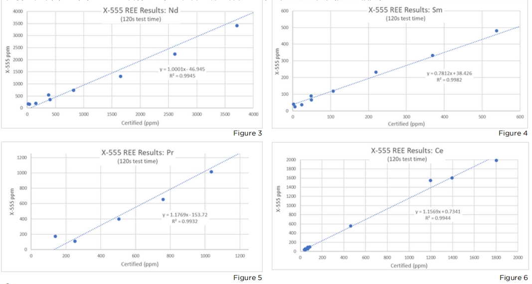 X-555具有特殊的屏蔽能力和3mm直徑的光束準直性,可直接用于巖石表面和巖芯。它還可以配備一個聯(lián)鎖試驗臺,用于袋裝或袋裝樣品的安全分析。在下圖3-6中,X-555對各種認證參考材料的研究結果顯示,它們與認證值有很好的相關性。
