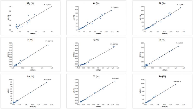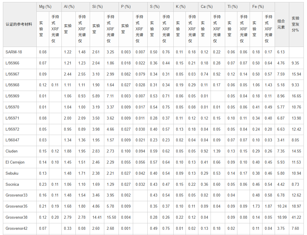 圖2. 奧林巴斯手持式XRF光譜儀檢測大量煤認(rèn)證參考材料(CRM)獲得的結(jié)果與這些材料的標(biāo)稱值高度吻合。上面的圖表表明對于重要元素:Mg、Al、Si、P、S、K、Ca、Ti和Fe,實(shí)驗(yàn)室認(rèn)證值和XRF分析儀獲得的數(shù)據(jù)值在準(zhǔn)確性和精確性方面都表現(xiàn)出高度的一致性。 數(shù)據(jù)表包含了繪制這些圖表所依據(jù)的實(shí)驗(yàn)室數(shù)據(jù)和XRF數(shù)據(jù)。數(shù)據(jù)承蒙新南威爾士大學(xué)生物和地球科學(xué)學(xué)院提供 - ACARP項(xiàng)目。
