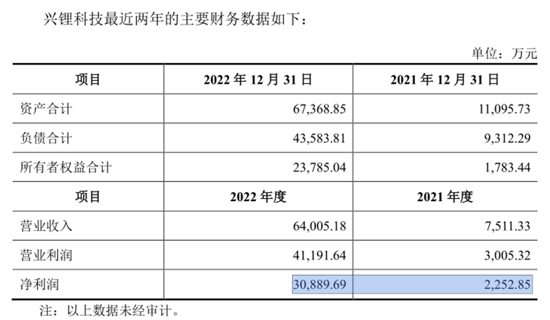 興鋰科技的凈利潤(rùn),2022年3.09億元,2021年2252.85萬(wàn)元,同比增長(zhǎng)12.71倍。