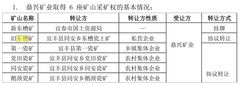 鞍重股份此前介紹,截至2021年8月5日,鼎興礦業(yè)持有共計(jì)6處瓷土礦采礦權(quán),礦界內(nèi)累計(jì)查明資源儲(chǔ)量約6000萬(wàn)噸,原礦處理能力50萬(wàn)噸/年。