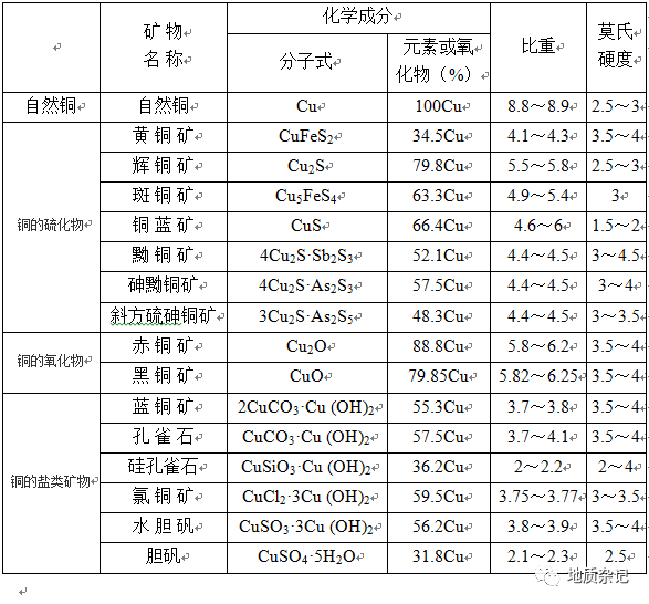 表  銅礦物化學成分及其比重