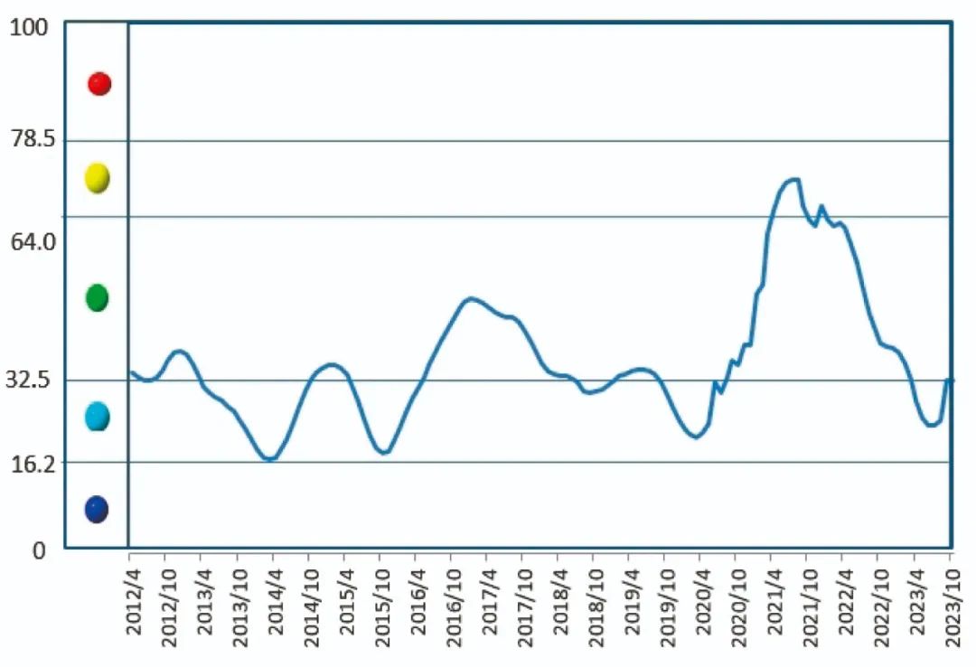 2023年10月份,中國鋁冶煉產(chǎn)業(yè)景氣指數(shù)為32.6,較上月上升1.3個點,處于“正常”區(qū)間下部。中國鋁冶煉產(chǎn)業(yè)月度景氣指數(shù)走勢見圖1。