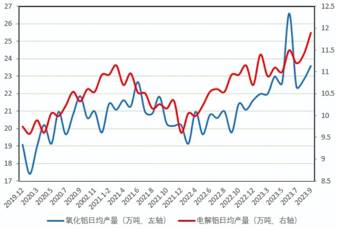 二是生產(chǎn)總體保持平穩(wěn)。9月份,全國電解鋁和氧化鋁的產(chǎn)能產(chǎn)量總體保持平穩(wěn)。部分地區(qū)電解鋁企業(yè)減產(chǎn),主要集中在云南地區(qū),云南地區(qū)枯水期將近,用電調(diào)節(jié)開始施行,部分電解鋁企業(yè)被要求提前采取電力負荷管控措施,實施降負荷運行,省內(nèi)計劃第一輪壓減相關(guān)電解鋁企業(yè)約20%產(chǎn)能,預計減產(chǎn)規(guī)模約為115萬噸。9月份,全國電解鋁產(chǎn)量為357.7萬噸,同比上升5.3%,日均產(chǎn)量11.9萬噸,環(huán)比上升0.3萬噸 ,同比上升0.6萬噸;氧化鋁產(chǎn)量為707.2萬噸,同比上升1.6%,日均產(chǎn)量23.6萬噸,環(huán)比上升0.8萬噸,同比上升0.1萬噸。鋁冶煉產(chǎn)品月度日均產(chǎn)量見圖5。