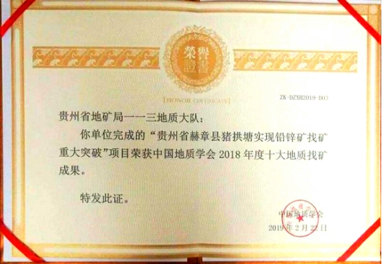 豬拱塘鉛鋅礦是地質(zhì)找礦新機(jī)制“商業(yè)跟進(jìn)”的又一成功范例,其重大找礦成果被業(yè)界高度認(rèn)可,先后榮獲中國(guó)地質(zhì)學(xué)會(huì)頒發(fā)“2018年度十大地質(zhì)找礦成果獎(jiǎng)”、第七屆“中國(guó)有色金屬地質(zhì)找礦成果獎(jiǎng)”一等獎(jiǎng)。