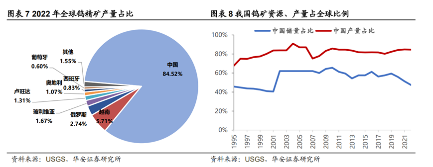同時,中國也是世界上鎢產(chǎn)量最豐富的國家。根據(jù)美國地調(diào)局(USGS)統(tǒng)計,2022年全球鎢礦產(chǎn)量8.4萬噸,其中中國產(chǎn)量7.1萬噸,約占全球總產(chǎn)量的84.5%。