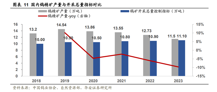 今年3月,自然資源部下達了2024年度首批僅為6.2萬噸的鎢礦開采總量控制指標(biāo),規(guī)模的收縮意味著國內(nèi)鎢精礦產(chǎn)量將延續(xù)下滑趨勢。隨著中國對鎢資源采取總量控制、出口配額管理、國家收儲等逐步收緊行業(yè)政策的實施,預(yù)計未來全球鎢礦供應(yīng)將逐步趨緊,鎢的產(chǎn)量增速將逐步放緩。