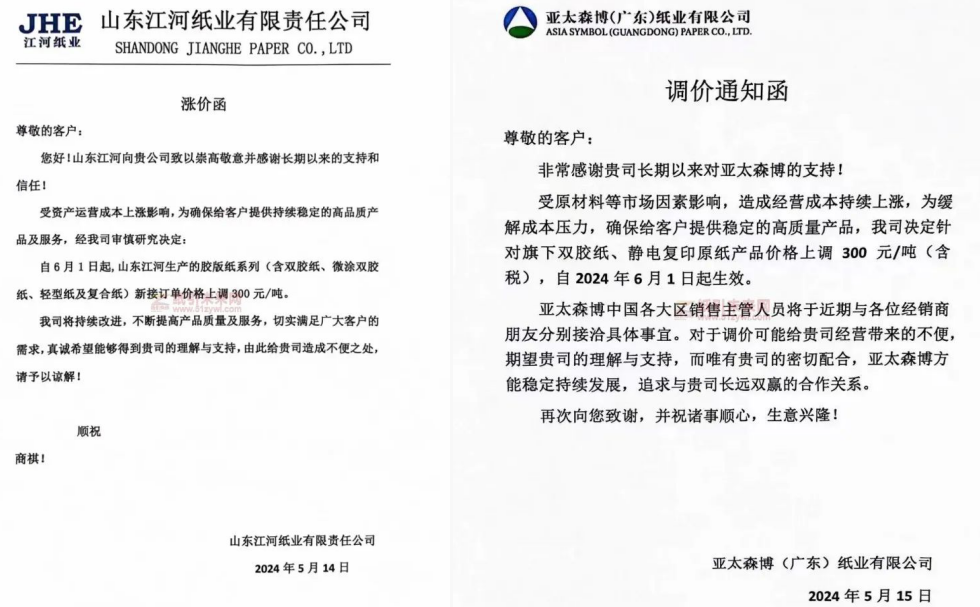 隨著文化用紙行業(yè)巨頭們的一紙公告,市場(chǎng)迎來(lái)了6月1日的統(tǒng)一價(jià)格上調(diào),每噸產(chǎn)品提價(jià)300元。山東江河紙業(yè)新接訂單價(jià)格上調(diào)300元/噸,山東華泰紙業(yè)所有文化紙系列產(chǎn)品價(jià)格上調(diào)300元/噸,山東晨鳴紙業(yè)文化紙產(chǎn)品價(jià)格上調(diào)300元/噸,亞太森博(廣東)紙業(yè)針對(duì)旗下雙膠紙、靜電復(fù)印原紙產(chǎn)品價(jià)格上調(diào)300元/噸(含稅)。