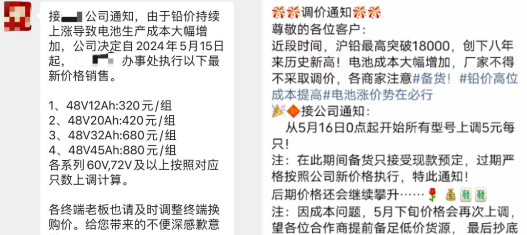 某電池品牌表示,從2024年5月15日起,48/12按照320元/組、48/20按照420元/組、48/32按照680元/組、48/45按照880元/組的價(jià)格執(zhí)行,各系列60V、72V及以上按照對(duì)應(yīng)只數(shù)上調(diào)計(jì)算;另有企業(yè)表示,5月16日開(kāi)始,所有型號(hào)電池上調(diào)5元/只,另外由于成本因素,5月下旬價(jià)格會(huì)再次上調(diào),建議電動(dòng)車(chē)行業(yè)商家合理安排庫(kù)存。