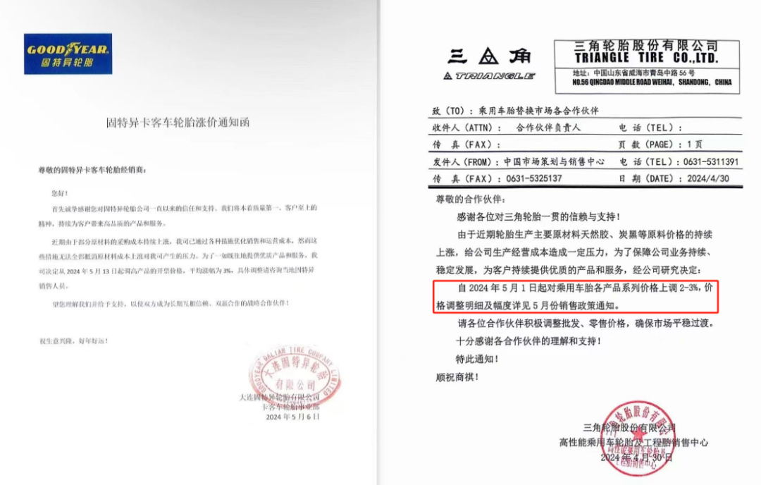 2月以來(lái),已有76家輪胎公司發(fā)布了92份漲價(jià)通知。僅在5月就有多家知名企業(yè)宣布產(chǎn)品漲價(jià),漲幅約3%左右。大連固特異輪胎漲幅3%,三角輪胎對(duì)乘用車(chē)胎各產(chǎn)品系列價(jià)格上調(diào)2-3%,上海優(yōu)科豪馬輪胎對(duì)乘用車(chē)輪胎產(chǎn)品調(diào)漲3%~6%,建泰橡膠(深圳)對(duì)建大集團(tuán)大陸市場(chǎng)PCR輪胎的替換市場(chǎng)價(jià)格上調(diào)3%-5%,瑪吉斯輪胎對(duì)瑪吉斯乘用車(chē)胎調(diào)漲2%。