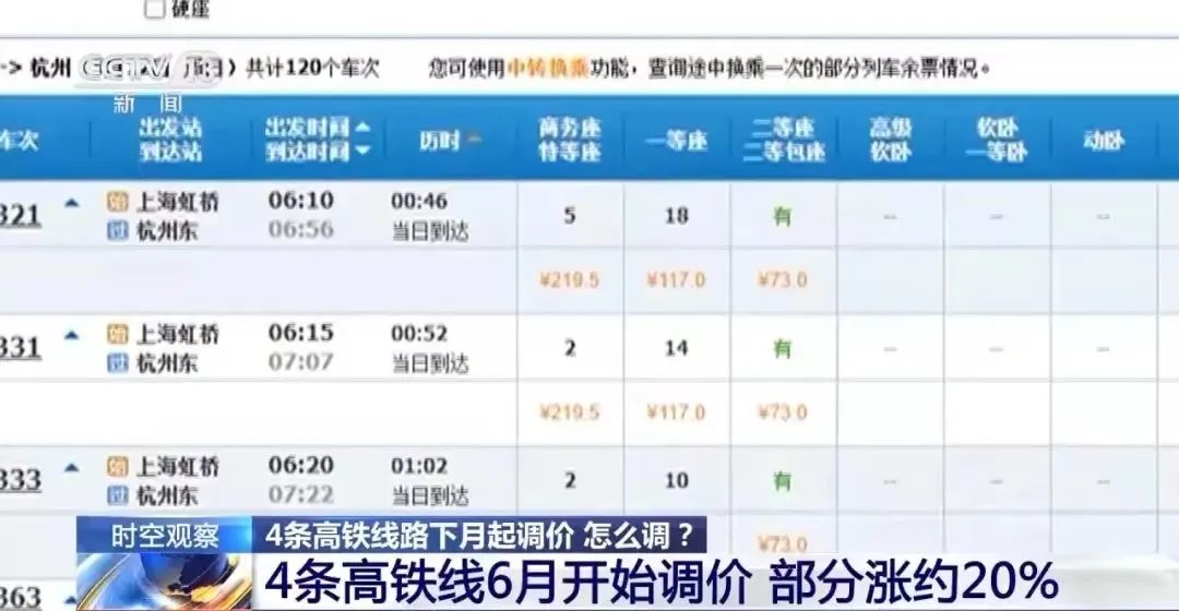 鐵路12306官網(wǎng)發(fā)布四則調(diào)價(jià)公告,自6月15日調(diào)整京廣高鐵武廣段、滬昆高鐵滬杭段、滬昆高鐵杭長(zhǎng)段、杭深鐵路杭甬段等4條熱門(mén)高鐵線路票價(jià),漲幅在19%-20%左右。