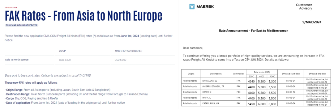 船公司們宣布新一輪運(yùn)價(jià)調(diào)整計(jì)劃,馬士基和達(dá)飛兩大航運(yùn)巨頭已宣布6月再提價(jià)計(jì)劃,上調(diào)北歐FAK費(fèi)率。其中,馬士基每40尺柜最高5900美元,達(dá)飛再次上調(diào)1000美元,每40尺柜6000美元。赫伯羅特、HMM等船公司繼續(xù)調(diào)整部分航線的費(fèi)率,涉及歐地、非洲、南美、北美等。5月上旬美線(運(yùn)價(jià))已經(jīng)連漲了兩次,每次各漲了1000美元左右,漲價(jià)還將繼續(xù),并將在5月下旬飆升到5000美元以上。