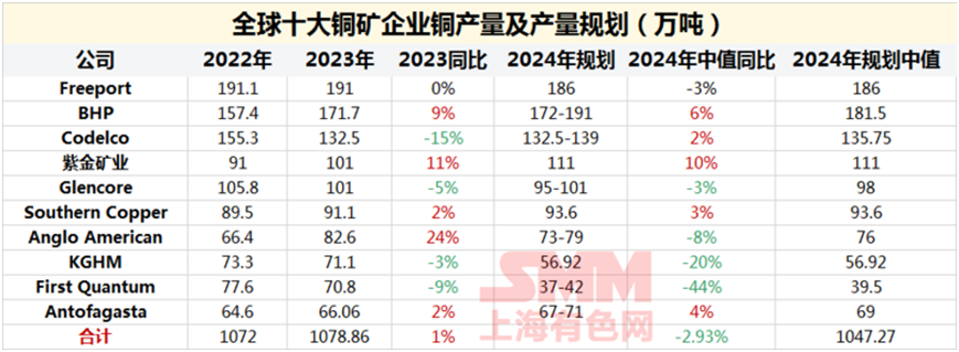 統(tǒng)計(jì)2023年全球十大龍頭礦企的產(chǎn)量數(shù)據(jù)顯示,智利國(guó)家銅業(yè)公司Codelco2023年產(chǎn)量降幅高達(dá)15%,第一量子First Quantum下降9%,嘉能可Glencore和波蘭KGHM產(chǎn)量分別下降5%和3%。據(jù)計(jì)算,十大龍頭礦企2023年總產(chǎn)量增幅僅為1%。