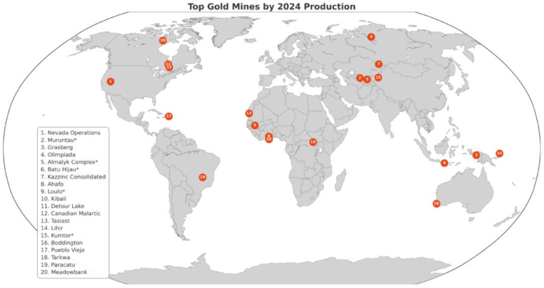 全球前二十大金礦主要分布在中亞,東南亞和非洲等地區,中國無上榜金礦。