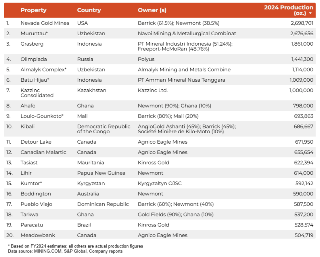 根據實際或估計的產量,外媒mining.com對2024年前20名黃金生產業務進行排名。位于美國內華達州的內華達金礦(Nevada Gold Mines,簡稱NGM)2024年生產269.87萬盎司黃金(約84噸),是全球最大的金礦綜合體。該綜合體自加拿大黃金巨頭巴里克黃金放棄對美國競爭對手紐蒙特的敵意收購后,雙方創建的合資公司,將兩家公司在內華達州的資產合并在一起。目前,該金礦綜合體包括10個地下礦山和12個露天礦組成,巴里克黃金(Barrick Gold)持股61.5%,紐蒙特(Newmont)持股38.5%。